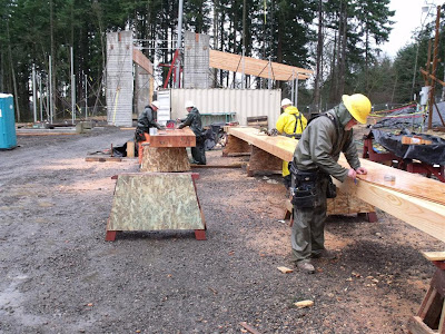Workers are milling (preparing) the rafters so they will fit into the structural brackets.